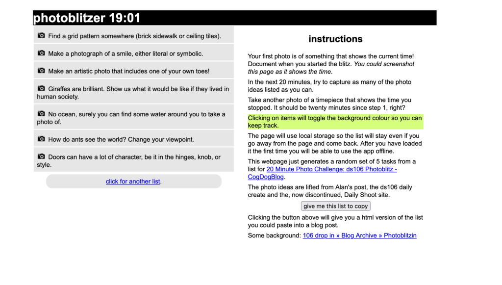 I did the 20 minute Photoblitz last night, here were my prompts: